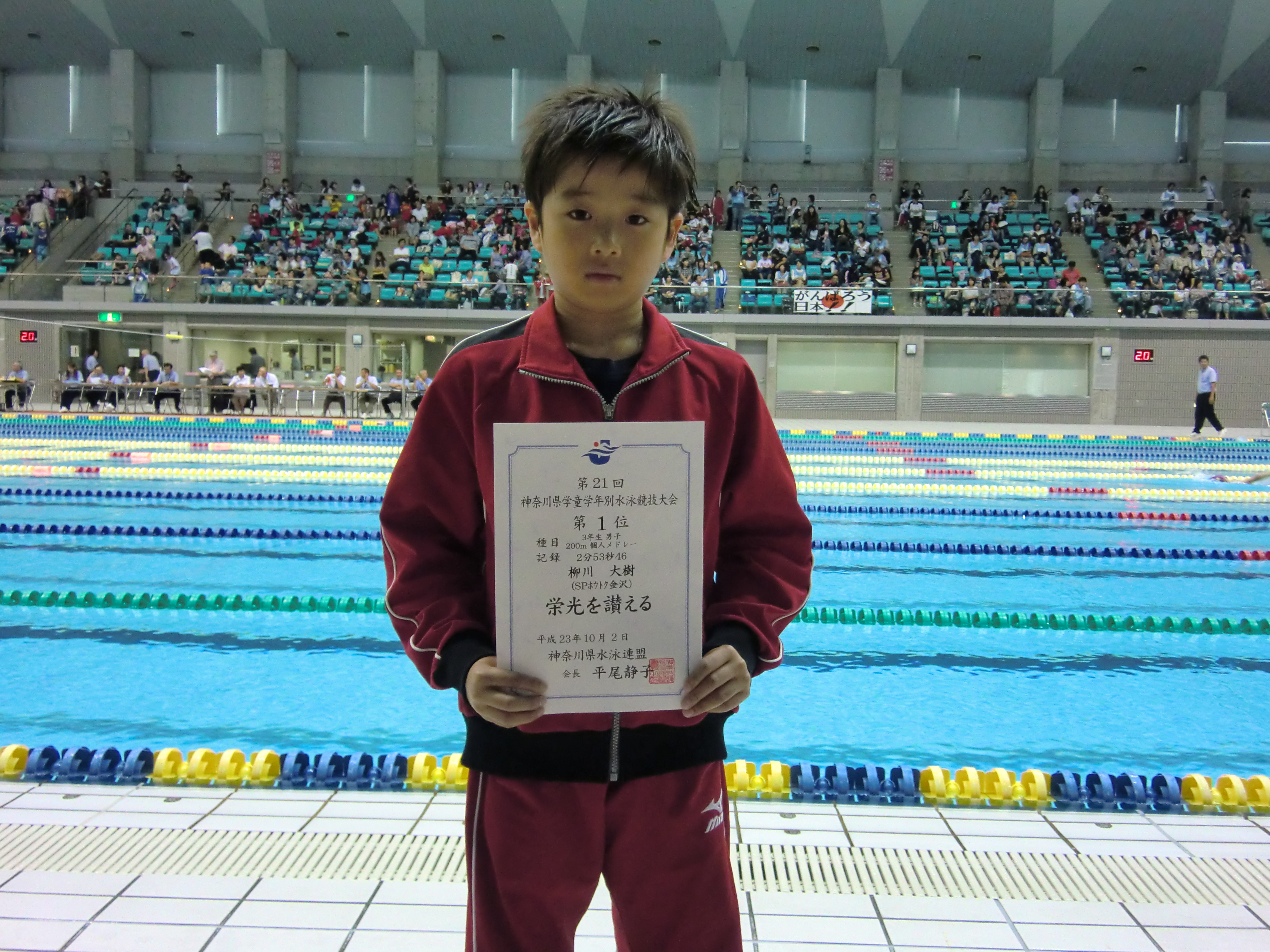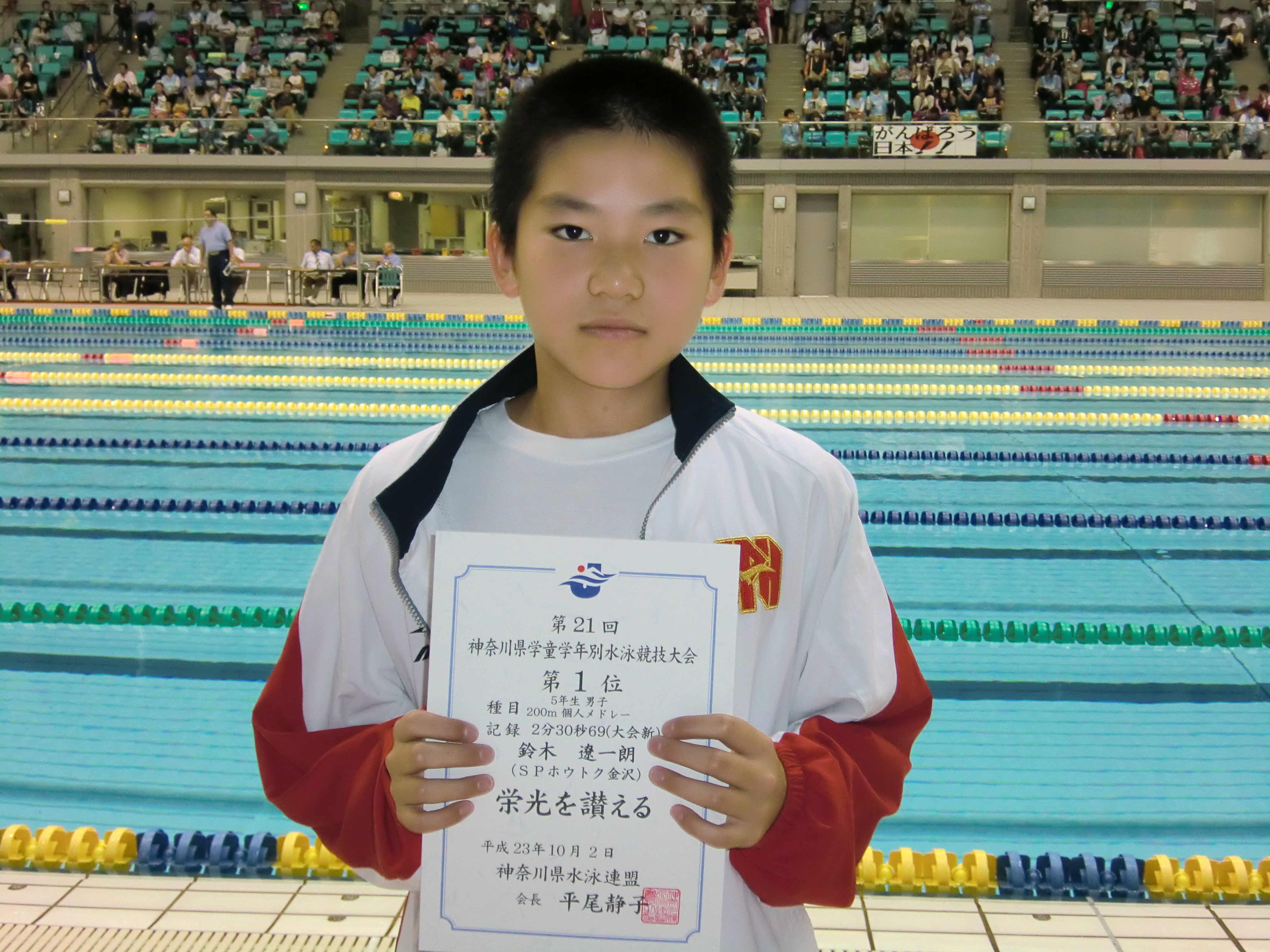 平成23年度夏ジュニア選手権にて、金沢スクールにて13~14歳男子200m自由形にて石川條太郎君が優勝いたしました。