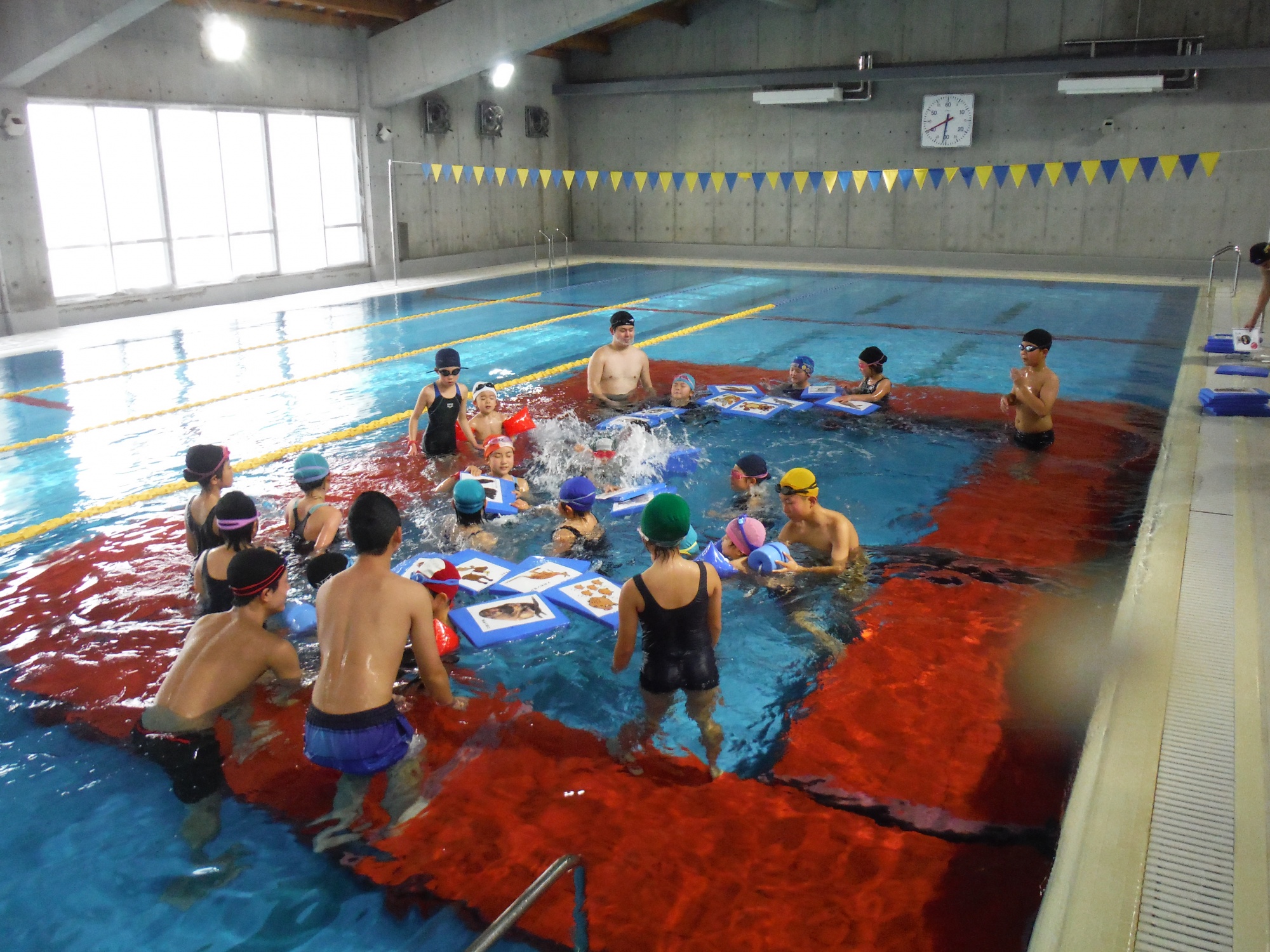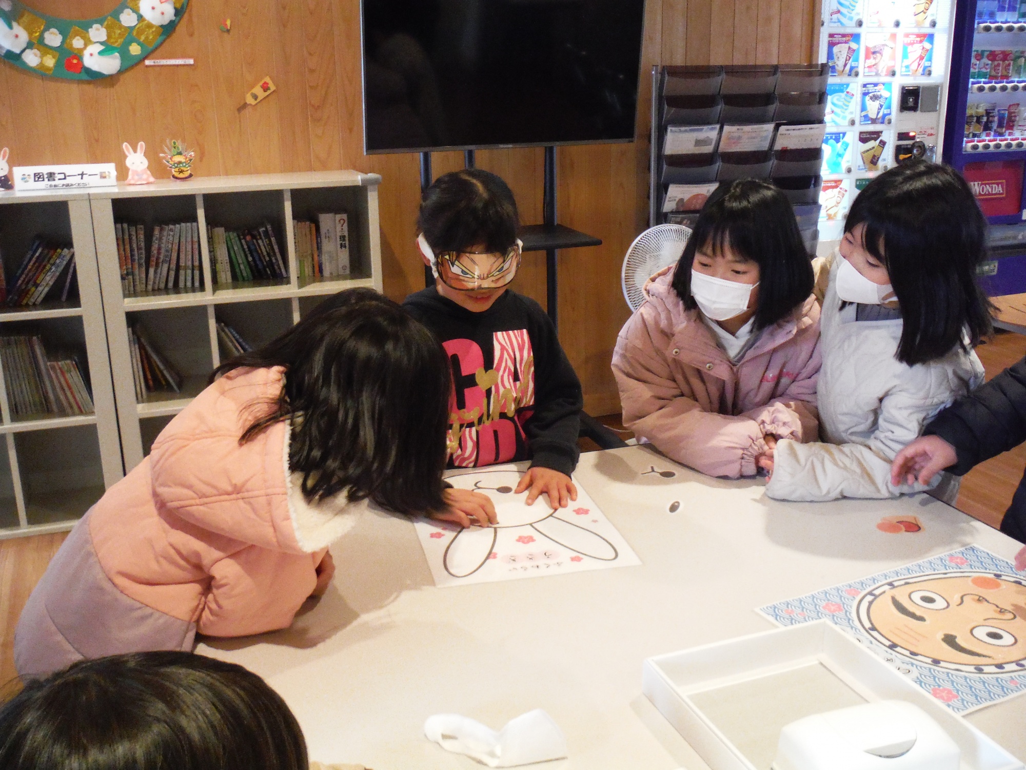 もちつき体験をし、つきたてのお餅を美味しくいただき、福笑い、プールでビート板かるた大会をしました。