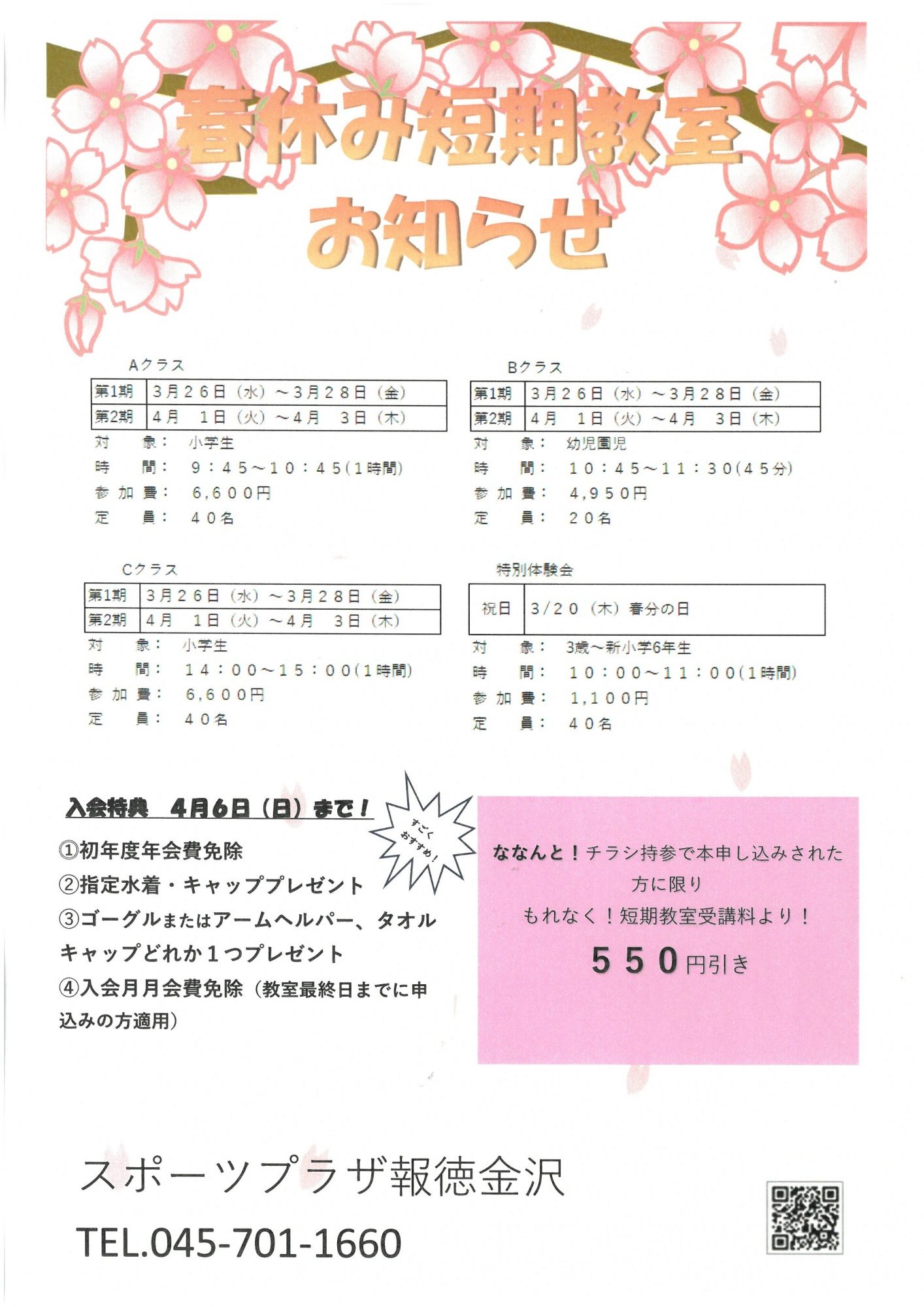 「短期」お申込み予約の方は下記までご連絡ください! スポーツプラザ報徳金沢スクール ℡045-701-1660