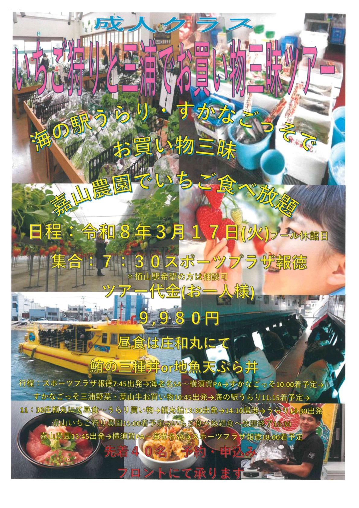 〇成人イベント〇 「いちご狩りと三浦でお買い物三昧ツアー」 ●参加者募集中!● 成人様を対象に、海の駅うらり・すかなごっそで お買い物三昧! 嘉山農園でいちごも食べ放題!! ぜひ、ご参加くださいませ! 期 日:令和8年3月17日(火) 参 加 費:9,980円(税込) 定 員:先着40名様限定! 申込方法:フロントにてお申込みください! チラシはこちらをクリック ↓ いちご狩り2026![]()