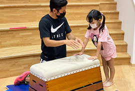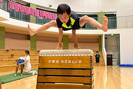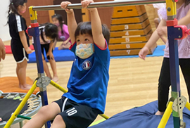 1時間のレッスン内で様々な運動(マット・跳び箱・鉄棒・縄跳び)が経験出来て、体力の向上も見込める「サーキット運動」を取り入れています。「見て学ぶ時間」と「動いて学ぶ時間」をバランス良く経験しながらたくさんの種目に挑戦出来るので大きな達成感が得られます。