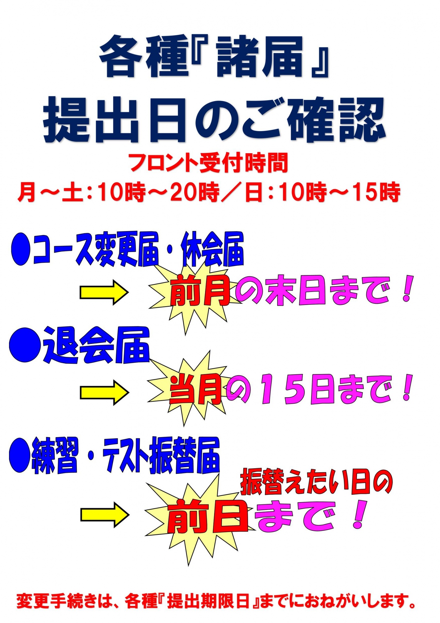 練習振替・テスト振替☆電話受付時間のお知らせ(諸届)