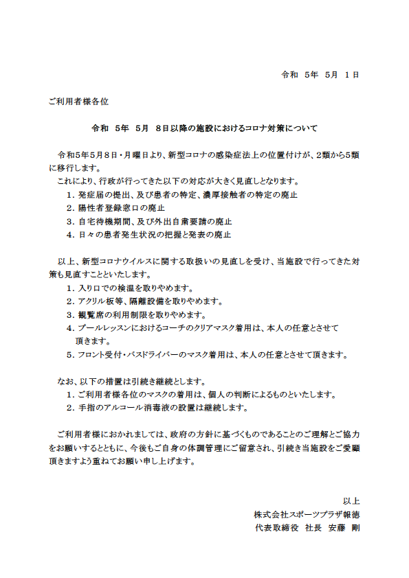 平素より当スクールをご利用頂き誠にありがとうございます。 令和5年5月8日より新型コロナウイルスは感染症法上の位置づけが、 2種から5種へ移行します。 これに伴い新型コロナウイルスに関する取扱いの見直しを受け、 当スクールで行ってきた対策も見直すことといたします。 ご利用の皆様におかれましては、 行政の方針に基づくものであることをご理解とご協力を お願いするとともに、今後もご自身の体調管理にご留意され、 引続き当施設のご愛顧いただきますようお願い申し上げます。ダウンロードはこちらから↓ 令和5年5月1日 感染症見直